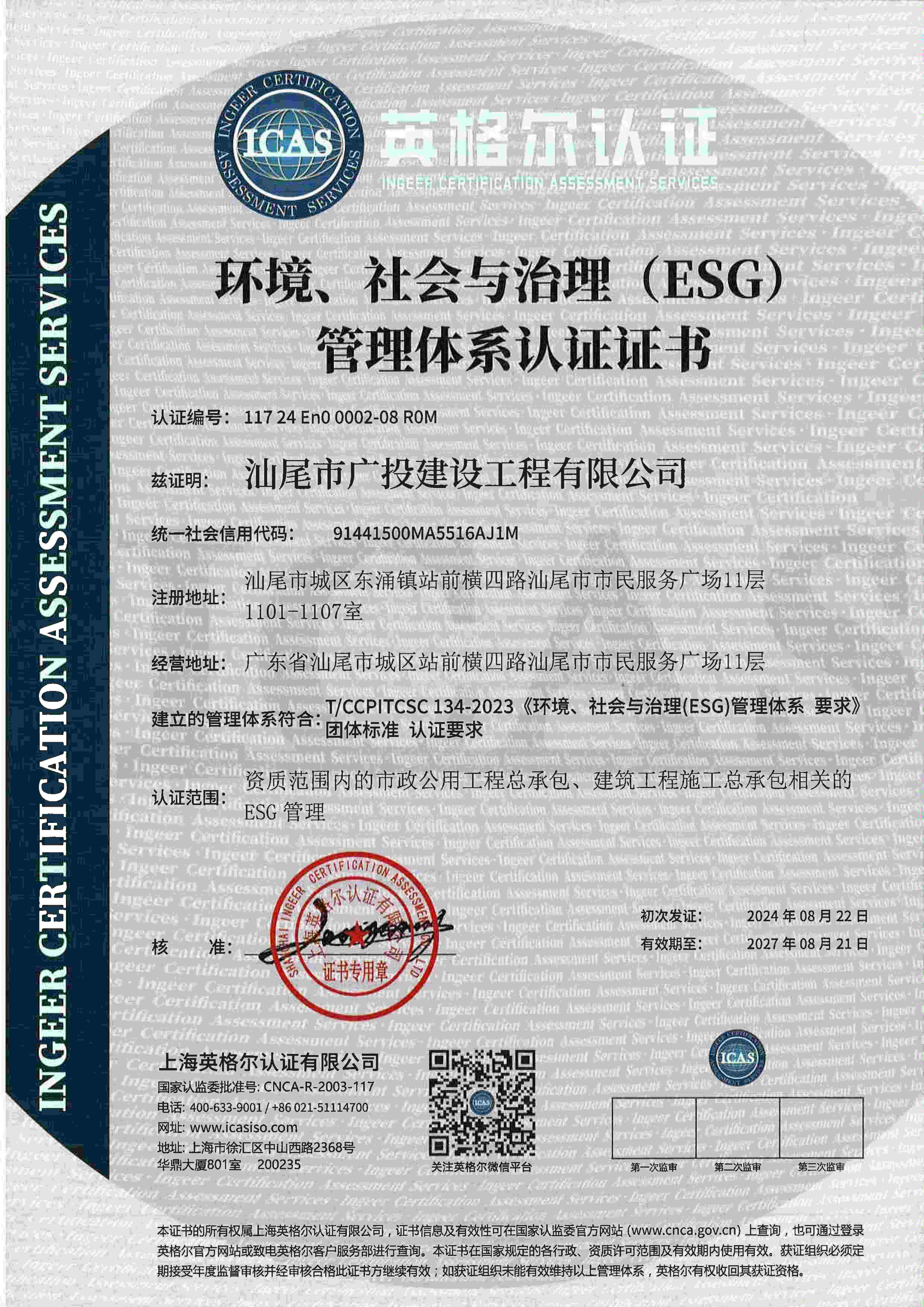 為推進(jìn)企業(yè)綠色發(fā)展,實(shí)現(xiàn)“雙碳”目標(biāo),汕尾市廣投建設(shè)工程有限公司(以下簡(jiǎn)稱“汕尾廣投公司”)率先引入ESG管理體系,于近日榮獲中國(guó)基建行業(yè)首個(gè)ESG管理體系認(rèn)證。 ESG體系強(qiáng)調(diào)綠色低碳發(fā)展、社會(huì)責(zé)任、員工權(quán)益和公司治理等方面,引入該體系建設(shè)可從整體上持續(xù)優(yōu)化管理模式。通過(guò)全要素成體系推進(jìn),8月22日汕尾廣投公司榮獲由ICAS英格爾認(rèn)證頒發(fā)的中國(guó)基建行業(yè)首張ESG管理體系認(rèn)證證書,成為國(guó)內(nèi)基建領(lǐng)域推行ESG管理的先行者。同時(shí),汕尾廣投公司榮獲ESG管理體系認(rèn)證是整個(gè)基建行業(yè)綠色轉(zhuǎn)型的一個(gè)重要里程碑,為推動(dòng)行業(yè)向綠色低碳轉(zhuǎn)型提供了新樣本。 汕尾廣投公司成立以來(lái),堅(jiān)持“創(chuàng)新、協(xié)調(diào)、綠色、開(kāi)放、共享”的發(fā)展理念,承接了多個(gè)重點(diǎn)民生項(xiàng)目和應(yīng)急工程,已成長(zhǎng)為區(qū)域基建領(lǐng)域的骨干力量。接下來(lái),汕尾廣投公司將繼續(xù)發(fā)揮國(guó)企優(yōu)勢(shì)和擔(dān)當(dāng),利用高新技術(shù)企業(yè)成功創(chuàng)建優(yōu)勢(shì),進(jìn)一步推進(jìn)綠色建筑和低碳技術(shù)的研發(fā)應(yīng)用,充分釋放ESG體系治理效能,為實(shí)現(xiàn)公司高質(zhì)量發(fā)展,落實(shí)省市《碳達(dá)峰實(shí)施方案》,助力區(qū)域基建行業(yè)綠色低碳轉(zhuǎn)型貢獻(xiàn)力量。